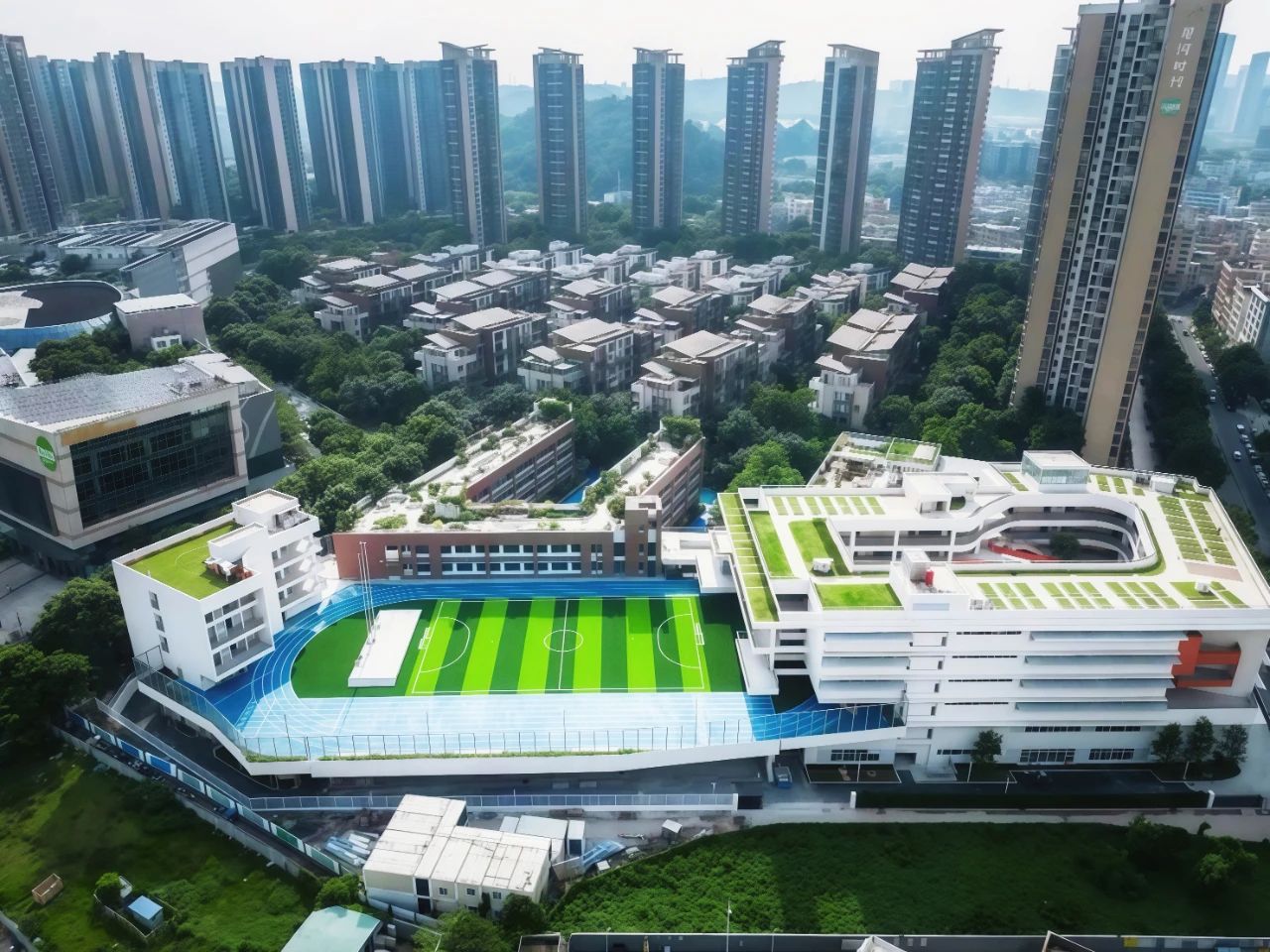 設計亮點:在深圳高密度城市背景下采用垂直校園建設,以“客家圍屋”格局形成北側為“知識”自然書院、南側為“運動”活力場院的南北兩進院落;校園通過擴建增加東側展示架,西側打造屋面活動平臺,北側布置新建教學樓,底部架空中心庭院穿插于建筑內部,不同標高退臺與屋面構成空中垂直綠化空間、新老建筑之間設計的綜合體系。