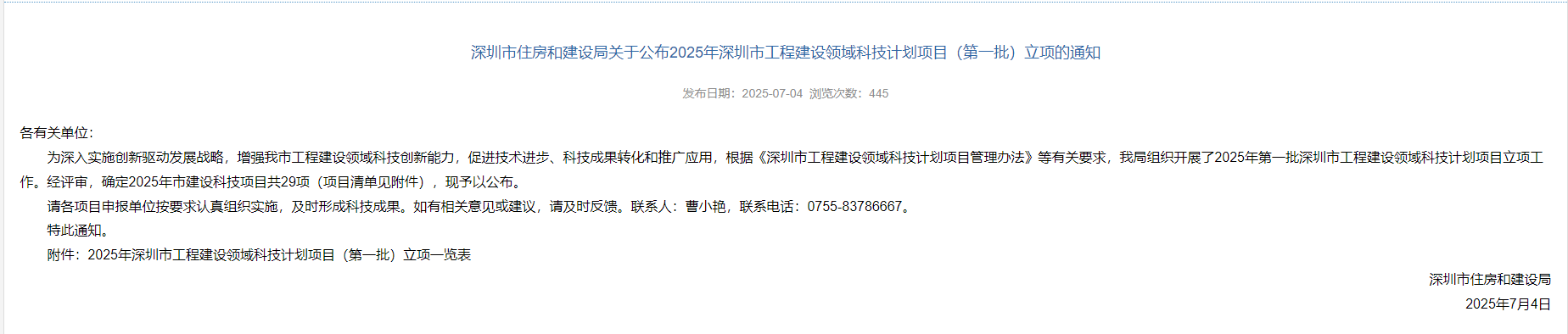 ?由公司牽頭申報(bào)的科技項(xiàng)目《面向智能建造的高層建筑全生命周期數(shù)字智能健康監(jiān)測(cè)技術(shù)研究與應(yīng)用》,成功通過2025年深圳市工程建設(shè)領(lǐng)域科技計(jì)劃項(xiàng)目(第一批)評(píng)審并獲批立項(xiàng)。